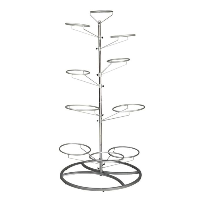 This gymnastics ball rack stores the balls vertically and spirally, allowing for space-saving storage of up to 10 gymnastics balls. The 10 storage surfaces are rotatable and adjustable in height.