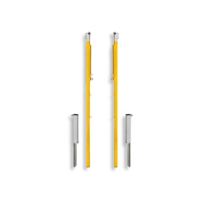 Steel tube 40 x 40 mm, steplessly adjustable from 160 - 202 cm, with rope guide roller and fastening eye for fistball bands, including ground sockets for embedding in the ground.