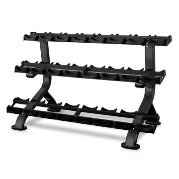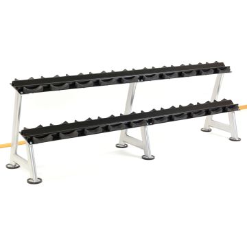 Dumbbells in weight training or strength training, fitness or boxing, like other barbell bars (barbells) and other weights, should be stored safely and in an orderly manner. Because clear storage not only creates order in training in the fitness studio, in the fitness room at home (home fitness) or when training in a club, it also leads to improved safety before and after fitness training or use. In dumbbell racks, the weights can be set at different levels, e.g. according to your weight level, sorted and filed. With the storage on a dumbbell stand, every trainee can immediately find the right dumbbell and there can be no accidents during training or before and after training or use, such as stumbling over the dumbbell or other training equipment. Dumbbell racks are simply part of the basic equipment in weight training and in many other sports areas. Most dumbbell racks in an attractive design are space-saving (different widths) and their storage shelves are very resilient, and some are provided with a rubberized protective pad. In other words, all dumbbell racks in our range can carry a variety of dumbbells and weights and are therefore very resilient and stable. In addition, the feet (often rubberized) are very non-slip and gentle on the floor. The dumbbell racks offer a high level of comfort for every athlete and the fitness equipment and many other training equipment can be found in our shop at a great price.