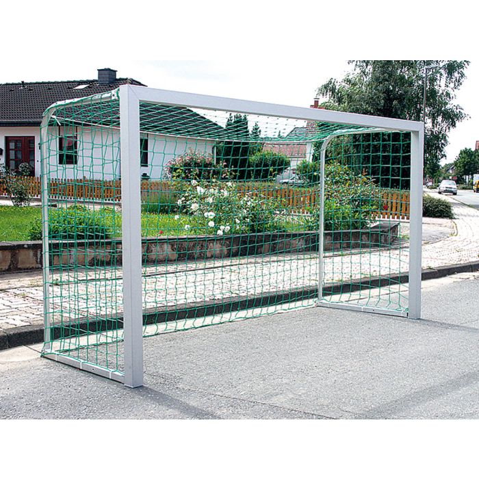 The goal is ideal for the schoolyard or other places where children play soccer or handball. A new, patented corner connection gives the goal a high stability. The net brackets can be easily folded down by loosening two screws. This allows the goal to be stored in a space-saving manner. The net is attached using plastic net holders, all around and also on the bottom frame. The ground bars have two 25 mm holes for attaching a ground fastening. When used in conjunction with e.g. F1983 or D5138, the goal is safety tested and complies with EN 16579.