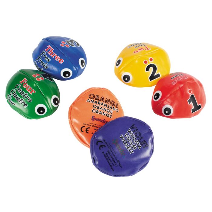 The beetles are numbered from 1 - 6 and the corresponding number is printed as a word in four languages (German, English, French, and Spanish) on each ball. Additionally, the color of the ball is printed on the bottom in the same four languages. The beetle balls are ideal for coordination and reaction training and for learning new languages.