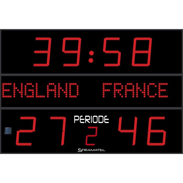 The scoreboard Stramatel® FRC AD (with horn & game period) from the Outdoor Series is perfectly suitable for use on sports fields and outdoor sports facilities. The brightness and color selection of the displayed numbers promise good visibility even in bad weather and from long distances.