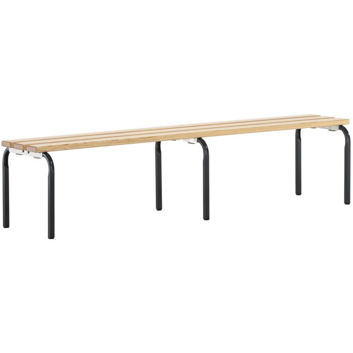 Sturdy construction made of powder-coated square steel tube 25x25 mm. Seat rests made of solid hardwood slats (European pine wood - planed, sanded, and natural-lacquered). Rubber stoppers to prevent scratching when stacked. Overall height: 45 cm, overall depth: 45 cm (seat depth: 33 cm). Length: optionally 101, 150 or 200 cm.